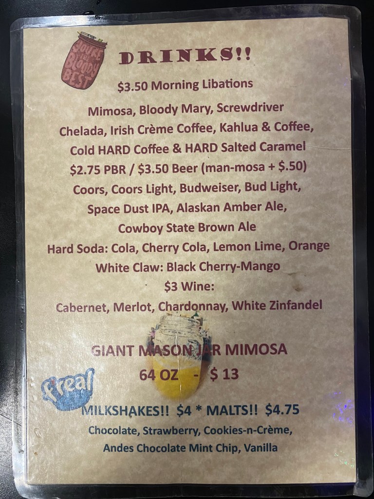 J’s Prairie Rose – Laramie Wyoming: 410 S 2nd St. We were very impressed by the hard working staff. The food was great and the location has a long history. The Drink Menu definitely caught my attention.